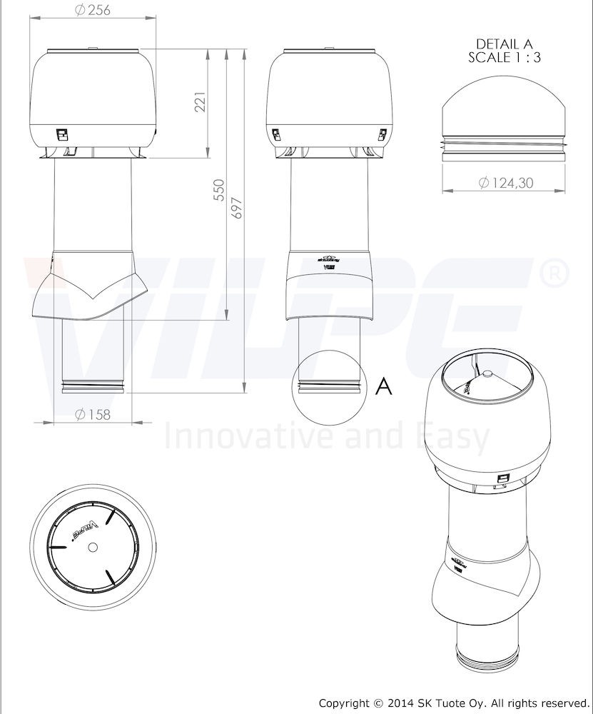 125/ИЗ/500 вентиляционный выход имеет трубу высотой 500 мм. Труба теплоизолирована для предотвращения образования конденсата в трубе. Внутренняя труба изготовлена из оцинкованной стали. Длина внутренней трубы позволяет вставить ее в подводимый воздуховод на длину 300 мм. Это облегчает вертикальный монтаж в тесных чердачных помещениях и делает конструкцию более прочной. Нижний край внутренней трубы имеет резиновый уплотнитель, герметизирующий соединение трубы и воздуховода. Колпак вентиляционного выхода защищает от попадания осадков и грязи в канал.