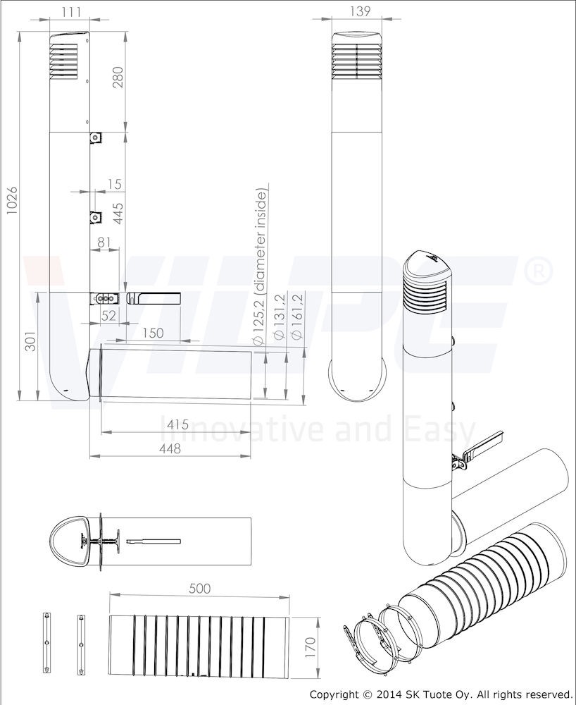 Монтаж: ROSS -125/135 устанавливают в отверстие в цоколе диаметром 135 мм. Горизонтальный патрубок соединяют с воздуховодом диаметром 125 мм. Вертикальная труба крепится к стене кронштейнами.