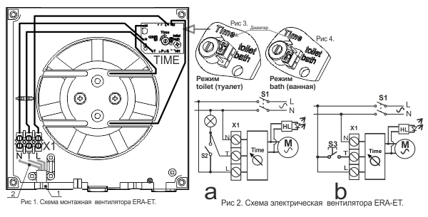 1. Toilet. Джампер находиться в положении рис.3. Вентилятор начинает работать сразу после включения освещения и работает все время, пока освещение включено. После выключения освещения согласно заданной программе вентилятор продолжает работу в интервале времени от 15 сек. до 45 мин, заранее устанавливаемого Вами регулятором «time», электрическая схема 2а.