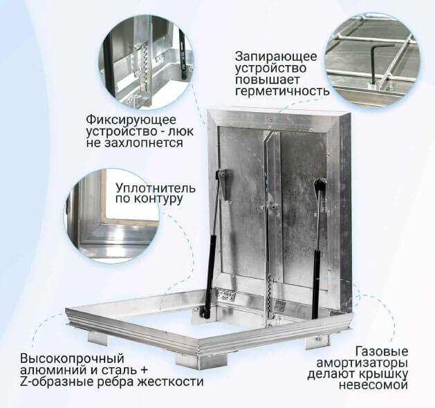 Выполнен из высокопрочного алюминия (АД31Т25) и оцинкованной стали (ГОСТ 14918 - 80), стойкой к агрессивным средам, не подвержен коррозии, имеет уплотнитель по контуру. Дополнительную герметичность обеспечивает запирающее устройство. Люк может применяться в банях и бассейнах.