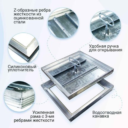 Защита от влаги и шума Каждый люк дополнительно оснащен силиконовым уплотнителем. По периметру рамы люка проходит водоотводная канавка.