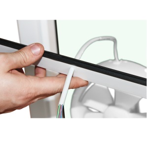 В заранее подготовленное отверстие в штапике (D - 6мм) вставляем провод электропитания вентилятора.