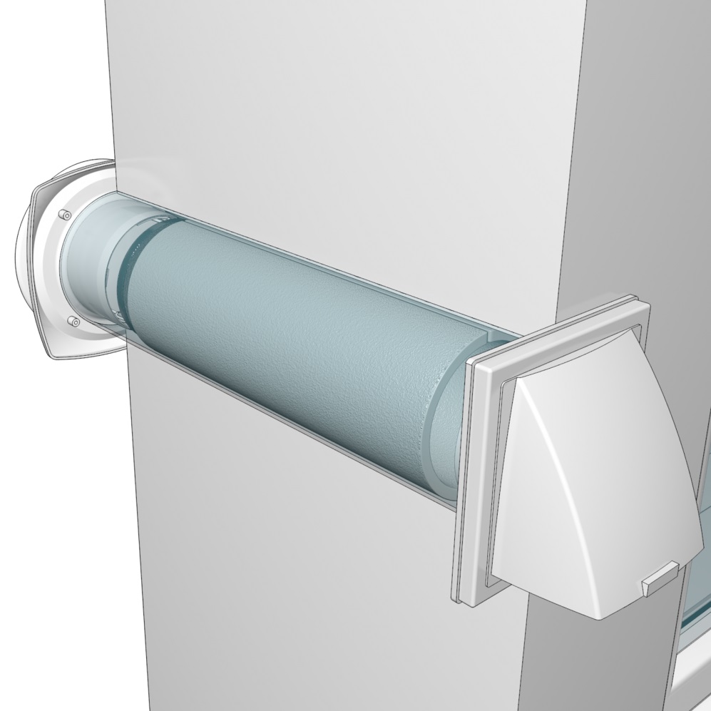 Устройство представляет собой трубу с теплошумоизоляционными свойствами и фильтрующими элементами. Снаружи закрывается решеткой. Изнутри – заслонкой с ручкой регулировки воздушных потоков.