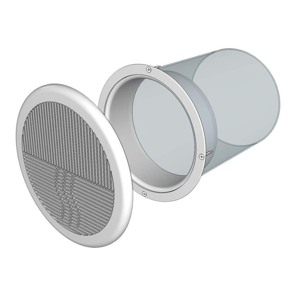 Типовой пример монтажа решётки РПКФ с круглым воздуховодом. Крепление осуществляется с помощью шурупов.