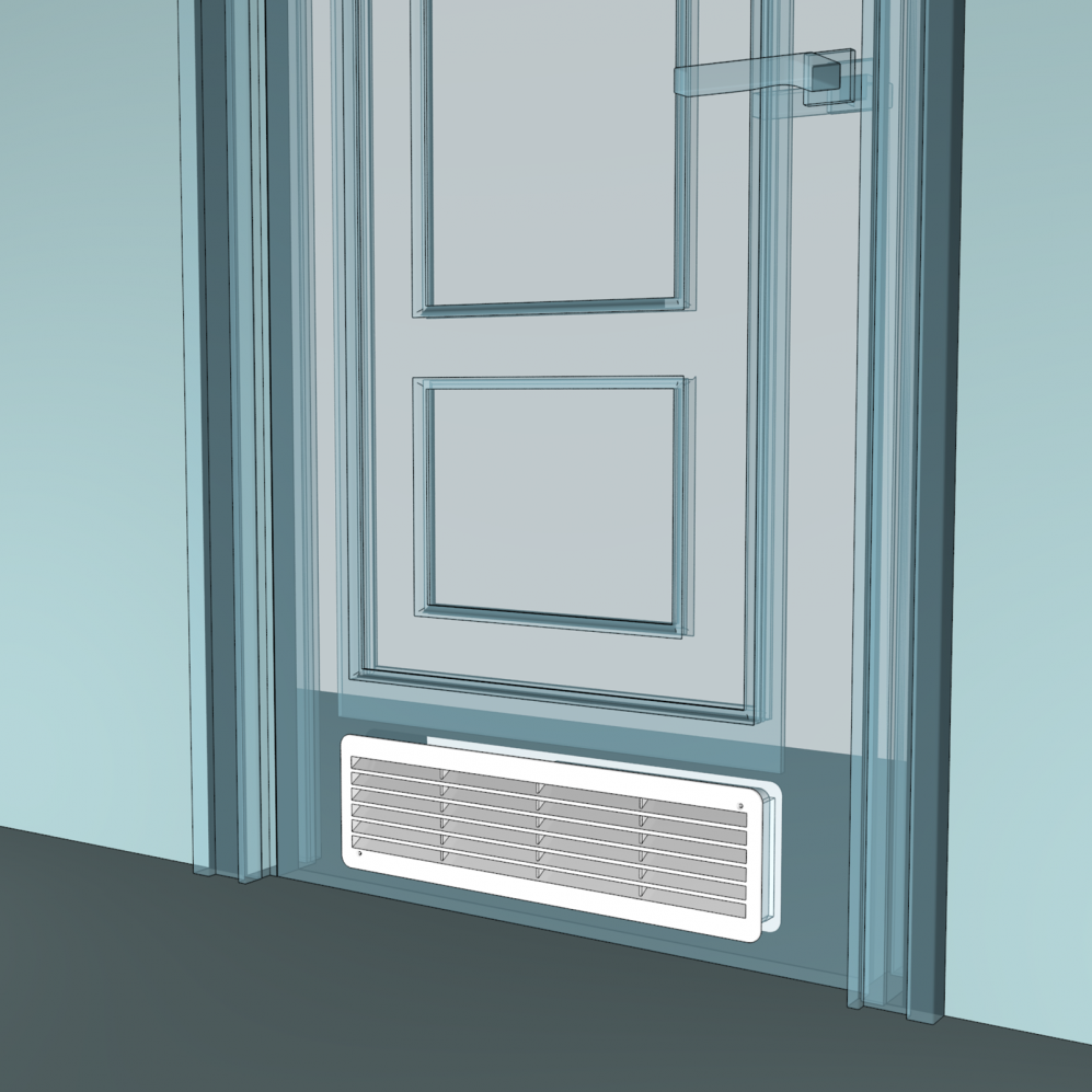 Типовой пример монтажа решётки 4409ДП в дверь. Обеспечивает беспрепятственную циркуляцию воздуха непосредственно по помещениям.