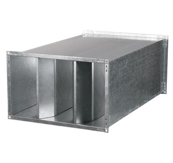 Конструкция Корпус шумоглушителя и оболочки пластин изготовлены из оцинкованной стали. Пластины наполнены негорючим звукопоглощающим материалом с защитным покрытием, предотвращающим выдувание волокон.