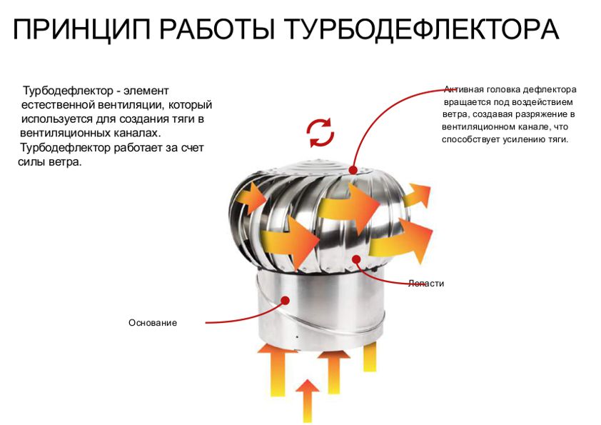 Турбодефлектор – элемент естественной вентиляции, который используется для создания тяги в вентиляционных каналах. Работает за счет силы ветра.
