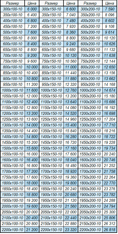 Пример: 300×100-10, где «300» — длина, «100» — высота, «10» — ширина щели по периметру решетки в миллиметрах. Если нужный размер отсутствует в таблице, то стоимость решетки обсуждается индивидуально. Указывается размер монтажного отверстия.