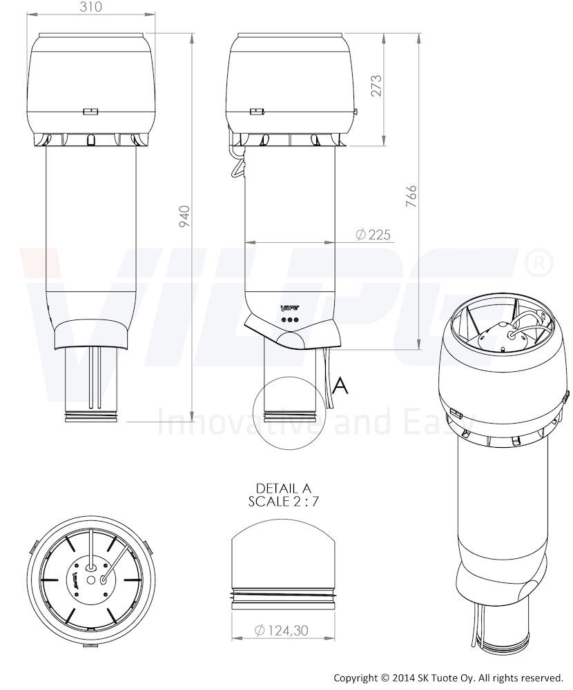ECo190Р/125/700 вентилятор представляет собой трубу с колпаком, в который встроен вентилятор. Труба теплоизолирована для предотвращения образования конденсата в трубе. Внутренняя труба изготовлена из перфорированной оцинкованной стали и имеет теплоизоляцию толщиной 50 мм. Длина внутренней трубы позволяет вставить ее в подводимый воздуховод на длину 300 мм. Это облегчает вертикальный монтаж в тесных чердачных помещениях и одновременно делает конструкцию более прочной. Нижний край внутренней трубы имеет резиновый уплотнитель, герметизирующий соединение трубы и воздуховода.